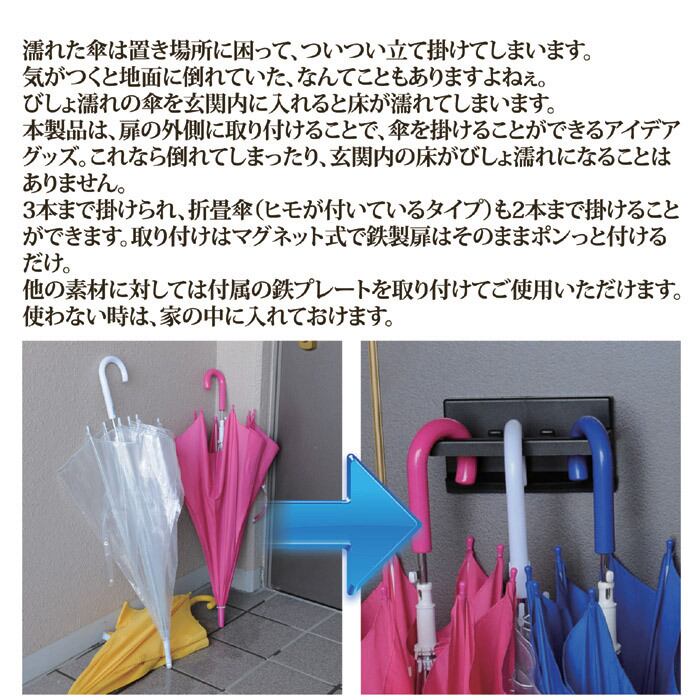 濡れた傘は置き場所に困って、ついつい立て掛けてしまいます。気がつくと地面に倒れていた、なんてこともありますよねぇ。びしょ濡れの傘を玄関内に入れると床が濡れてしまいます。本製品は、扉の外側に取り付けることで、傘を掛けることができるアイデアグッズ。これなら倒れてしまったり、玄関内の床がびしょ濡れになることはありません。3本まで掛けられ、折畳傘(ヒモが付いているタイプ)も2本まで掛けることができます。取り付けはマグネット式で鉄製扉はそのままポンっと付けるだけ。他の素材に対しては付属の鉄プレートを取り付けてご使用いただけます。使わない時は、家の中に入れておけます。
