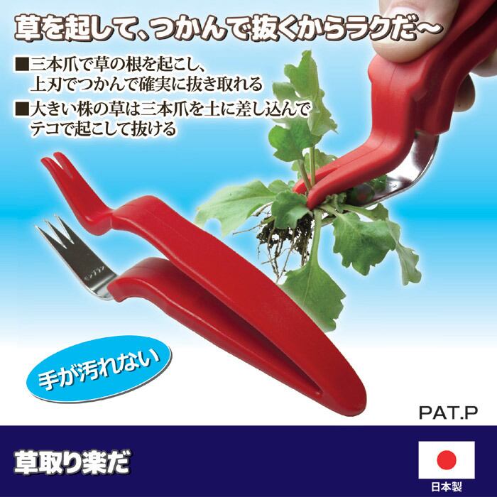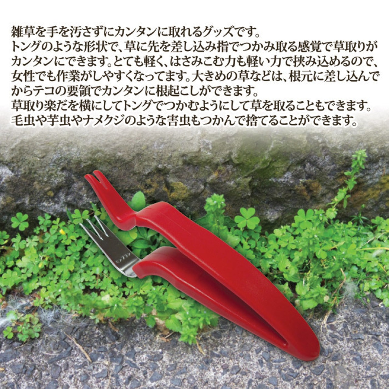 雑草を手を汚さずにカンタンに取れるグッズです。トングのような形状で、草に先を差し込み指でつかみ取る感覚で草取りがカンタンにできます。とても軽く、はさみこむ力も軽い力で挟み込めるので、女性でも作業がしやすくなってます。大きめの草などは、根元に差し込んでからテコの要領でカンタンに根起こしができます。草取り楽だを横にしてトングでつかむようにして草を取ることもできます。毛虫や芋虫やナメクジのような害虫もつかんで捨てることができます。