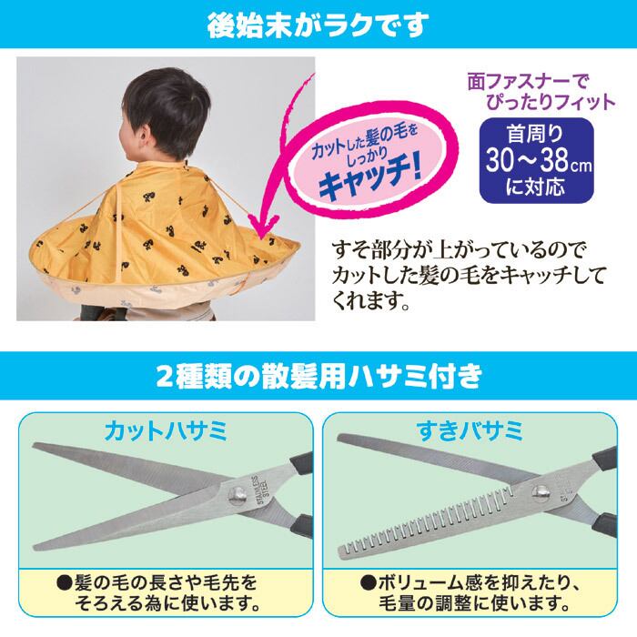 お子様の成長は早いものです。散髪も毎月のようにしないといかないのですが、お子様は何故か散髪屋さんに行くことをイヤがりますよね。だったら、お家で散髪をしてあげるのはどうでしょうか。パパやママの腕が試されることにはなりますが、親子のコミュニケーションがしっかり取れる良い機会でもあります。本製品は、ご家庭で散髪をする時に着用する専用エプロンで、切った髪の毛がエプロンの裾部分に留まるようになってます。エプロンに加え、カットバサミとすきバサミが付属されてますので、スグに散髪ができます。エプロンは、折りたためば直径30センチほどのコンパクトな大きさになります。