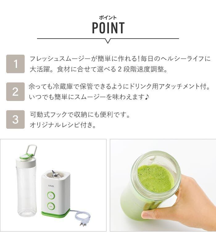 ご注文の多いソレイユ フレッシュスムージーメーカーのご紹介です。朝の忙しい時間に、手軽に栄養たっぷりのスムージーを作りたい方にぴったりのアイテムです。