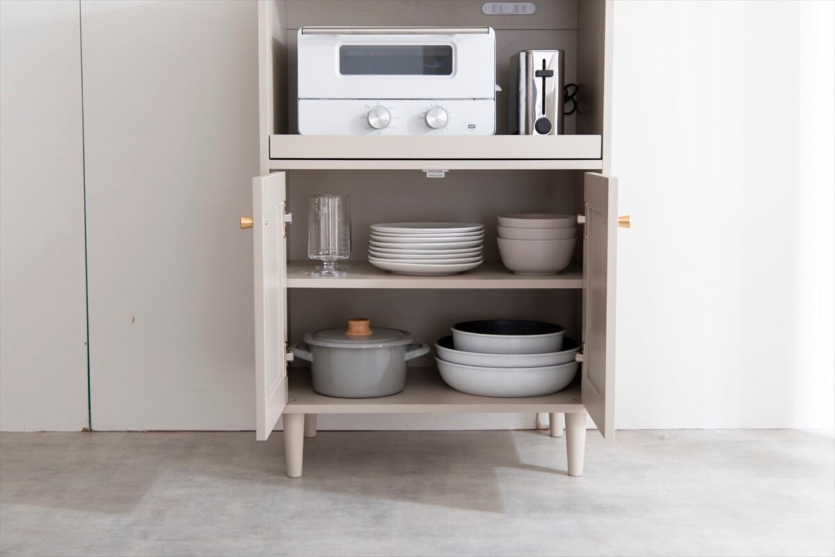 Calan レンジ台は、キッチンでの調理や収納をスムーズにサポートするアイテムです。幅60cmのコンパクトなサイズでありながら、しっかりと収納スペースを確保しています。上部は耐熱仕様の素材で作られており、安心して熱い鍋やお皿を置くことができます。