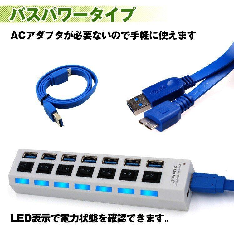 7ポートUSB3.0 ハブ スイッチ付 高速 USBコンセント ケーブル 充電器 変換