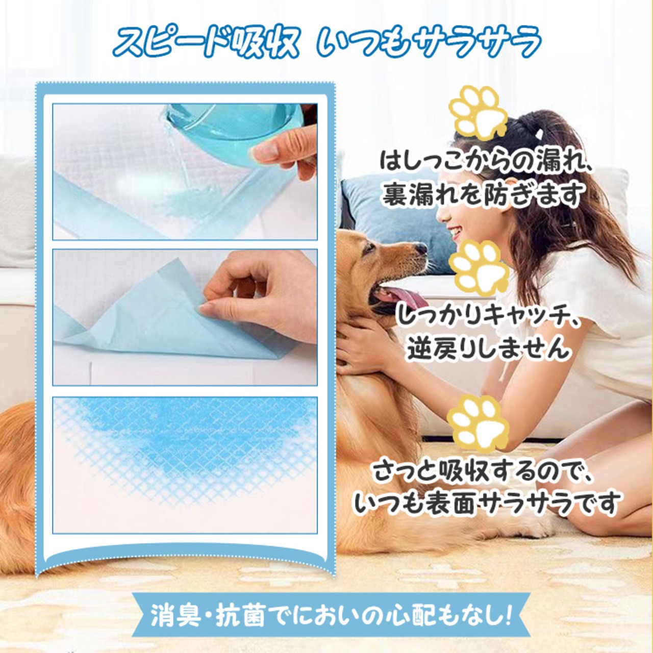 ぺットのトイレトレーニングに最適なアイテムです。特殊なポリマー素材が速やかに水分を吸収し、表面をサラサラに保ちます。薄型設計なので、使い捨て後も邪魔になりません。忙しい日常でも安心してご使用いただけます。ペットとの生活をより快適にするために、ぜひ一度お試しください。